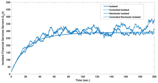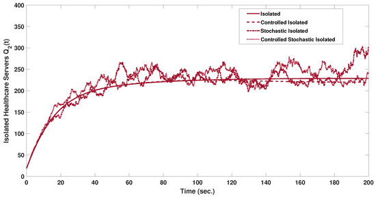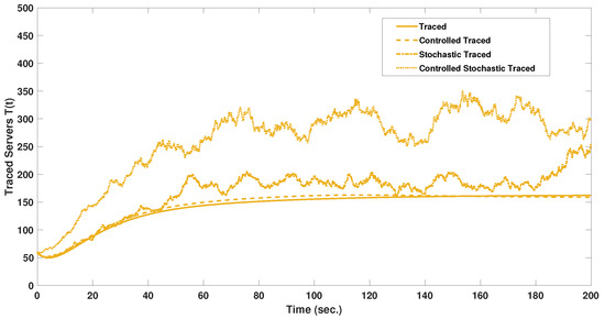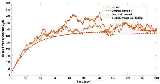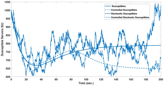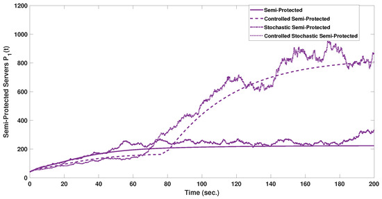 The stochastic and stochastic controlled MMCE models results are as shown in Figure 5 and Figure 6, respectively. The stochastic modeling process provides a more realistic representation of the servers’ state dynamics. Starting by analyzing Figure 5, the susceptible and protected servers settled at a value of 978, while the four infected servers’ categories settled at 101, 41, 54, and 153. And after control, as shown in Figure 6, the susceptible reduced to 717 servers with a reduction of 27%. In addition, the infected servers reduced to the settle values of 62, 35, 37, and 97. The semi-protected servers of the four categories increased significantly, by 166%, from a settle value of 325, as shown in Figure 5, to a controlled value of 863, as shown in Figure 6. So, the controller action also succeeded in maintaining a higher level of security in the stochastic MMCE by increasing the total number of servers on the traced, isolated, and semi-protected states and decreasing the total number of servers in the susceptible and infected states. Figure 7, Figure 8, Figure 9, Figure 10, Figure 11, Figure 12 and Figure 13 show a visualization comparison of the susceptible, isolated, traced, and semi-protected server dynamics of all supposed models under study with and without control.