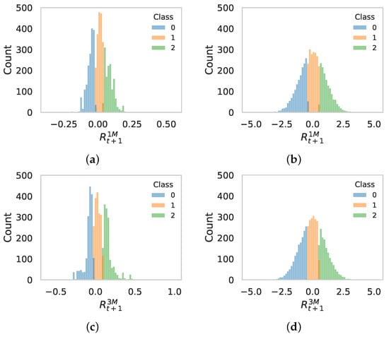 Using the panel dataset containing 4970 observations, we define three categories based on the 1- and 3-month-shifted returns ( and ). Labels for training the classification models employed are determined based on the average return () and the standard deviation () of and . To ensure balanced subsets, the labels are assigned as follows.
