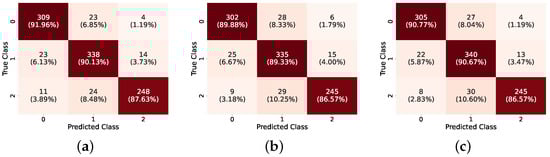 Confusion matrix on test data for the three classifiers with general accuracy greater than 0.800 in predicting the 1-month return classes. Overall, the models find an 86.6–92.0% TP rate for classes 0 and 2 and an 89.3–90.7% TP rate for class 1. (a) LightGBM, (b) Random Forest, (c) Extra Trees.