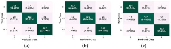 Confusion matrix on test data for the three classifiers with general accuracy greater than 0.800 in predicting the 3-month return classes. Overall, the models find a 93.2–95.7% TP rate for classes 0 and 2 and an 87.3–88.7% TP rate for class 1. (a) LightGBM, (b) Random Forest, (c) Extra Trees.