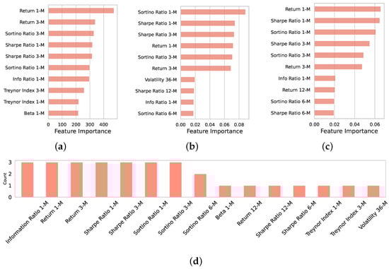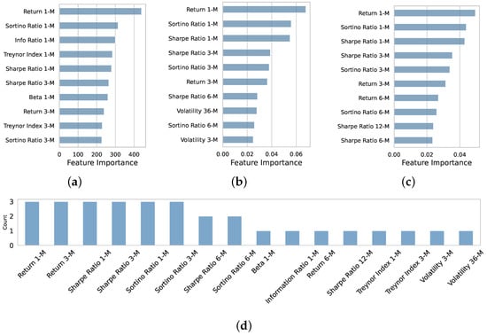 Feature importance measures how significantly each feature contributes to the accuracy or relevance of predictions in a classification task. Figure 4 and Figure 5 display the feature importance plots for predicting 1- and 3-month returns. For the 1-month return predictions, all three models rank ‘Return 1-M’ and ‘Sortino Ratio 1-M’ as the top features. In total, 16 features are highlighted as important features for at least one model. Taking into account all models, six characteristics are consistently significant, as shown in Figure 4d.