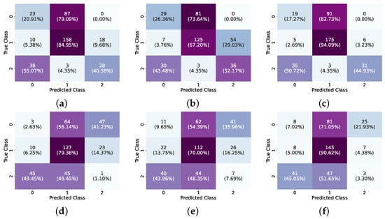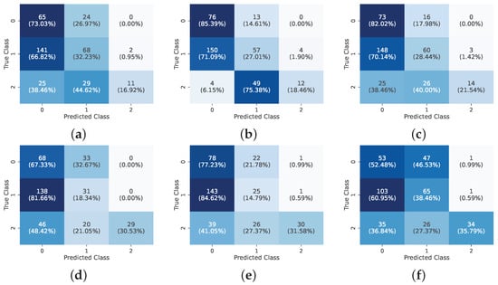 Confusion matrices for different classifiers’ forecasts of 3-month return on unseen data: comparison of 1 and 2 months ahead. (a) LightGBM (one month ahead), (b) Random Forest (one month ahead), (c) Extra Trees (one month ahead), (d) LightGBM (two months ahead), (e) Random Forest (two months ahead), (f) Extra Trees (two months ahead).