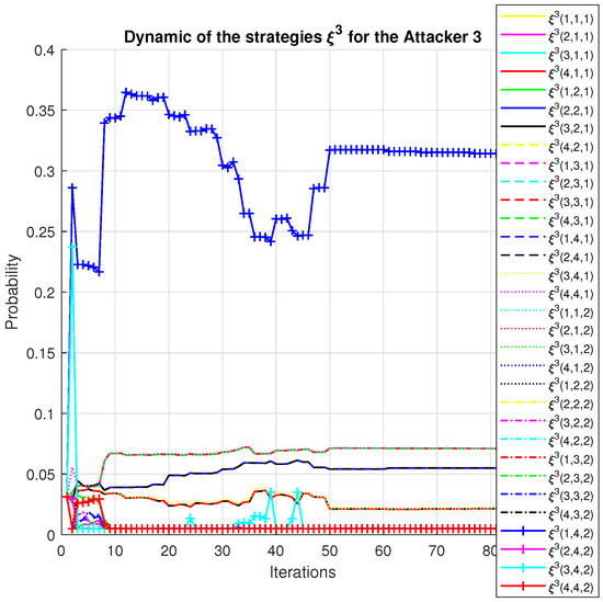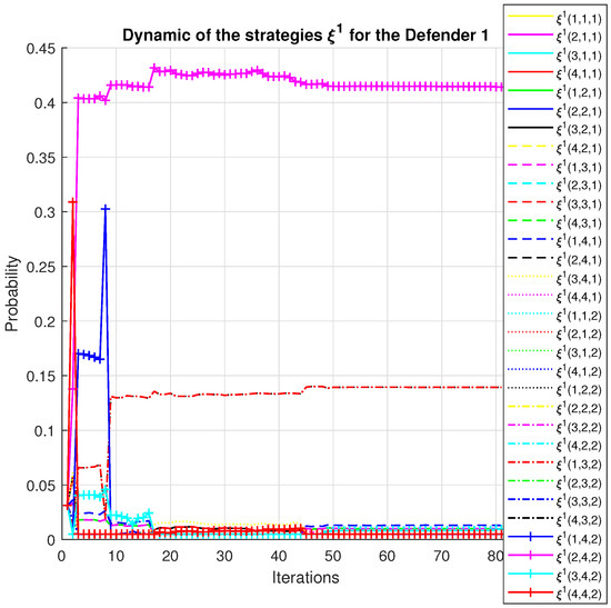 1. Choose randomly an initial type for the defenders and attackers . 2. Let and be the resulting policies and, and the resulting strategies. 3. For each attacker r and defender Do 4. Choose a type and 5. Choose actions and . 6. From select considering and from select considering . 8. Update the original values by including and to the random walk process. 9. Repeat steps 3–8 until the status expressed in Equation ( 19) is met. |