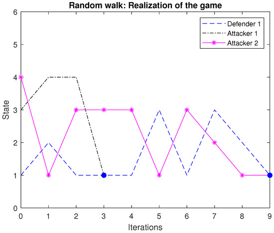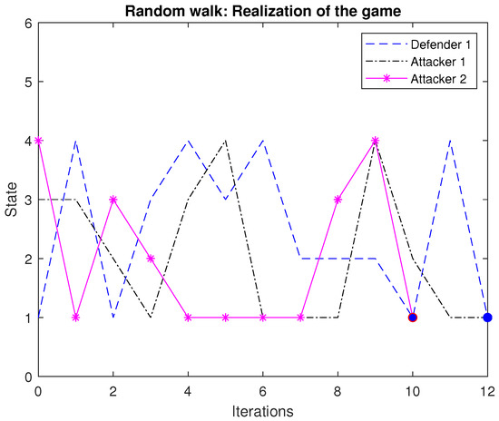 The random walk process for the SSG is described by Algorithm 3 as follows. We will look at a game in which four players compete: defenders and attackers. Both sides have the option of using a randomized approach. The defenders and attackers can both move to any state at the same time. The defenders’ goal is to catch the attackers in the fewest possible steps. The attackers, on the other hand, choose a strategy that maximizes the amount of time it takes for the defenders to catch the attackers. If one of the defenders moves to a state where an attacker is, they are said to be caught. The game is over when the defenders have caught the attackers. We refer to a random walk as a discrete-time Markov process in a finite-type space . The random walk is assumed to be time-homogeneous. This means that the distribution given is solely dependent on and not on time t. To ensure that the random walk does not become ’stuck’ in some place of the state space, we also require some type of irreducibility: the set is finite.