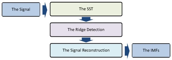 The SST is a method for providing the Time–Frequency Representation (TFR) of a signal. From the mathematical point of view, the SST is a particular type of time–frequency reassigned transform with a reconstruction capability [9]. The SST has exciting features for the analysis of real complicated signals, namely decomposing an Amplitude- and Frequency-Modulated (AMFM) signal into the contributing Intrinsic Mode Functions (IMFs) [10]. While the SST was first introduced for the Continuous Wavelet Transform (CWT) [11], there are other backgrounds for the SST, such as the Short-Time Fourier Transform (STFT) [10]. The SST has several advantages: Firstly, it may provide more reliable TFRs by providing “high-resolution” time-scale representations [12]. Also, the SST requires less computational burden than the CWT and STFT due to one-dimensional integrals [13]. Furthermore, the SST has time-domain reconstruction and mode separation capabilities [14]. Finally, it is reported that the SST performs better than the EMD-based methods for decomposing complicated signals, while the SST is faster than the EMD-based methods [15]. Due to these advantages, the SST has been used in various applications [16,17,18,19,20,21,22].
