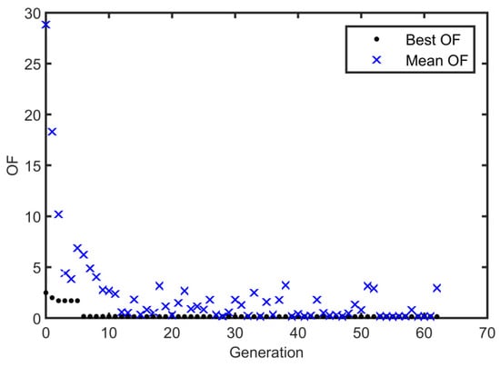 It should be noted that the values of the OC are an order of magnitude less than those of the EC and MSEC; therefore, the OC is multiplied by 10 in the OF. The best and mean values of the OF are plotted against the number of generations in Figure 3. It can be seen that the OF has converged to its best value after 62 iterations.