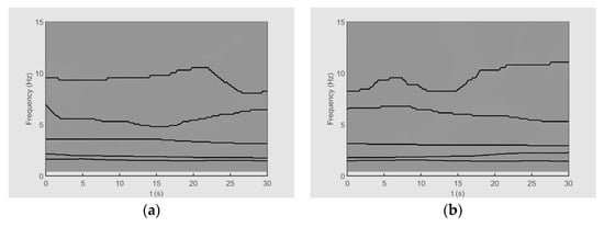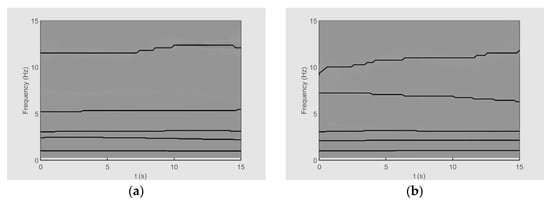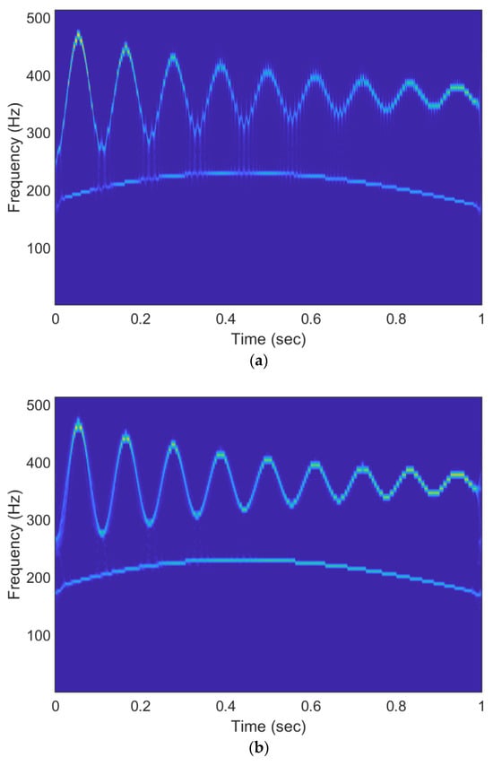 Finally, the TFRs obtained by the SST and ESST are shown in Figure 4. The existence of two AMFM modes can be seen in both cases. According to Equations (13) and (14), the chirp signal of and the damped sinusoidal signal of can be easily recognized in both TFRs. Nevertheless, it can be observed that the TFR provided by the ESST is more “readable”. The SST disperses energy, while the ESST provides a sharper, more focused representation.