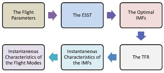 The flowchart for obtaining the instantaneous characteristics of the flight modes is summarized in Figure 5. The process involves extracting the ridges from the time–frequency representation, reconstructing the corresponding IMFs, and calculating the instantaneous frequency, amplitude, and phase. These characteristics are then used to determine the undamped natural frequency and damping ratio of each flight mode.