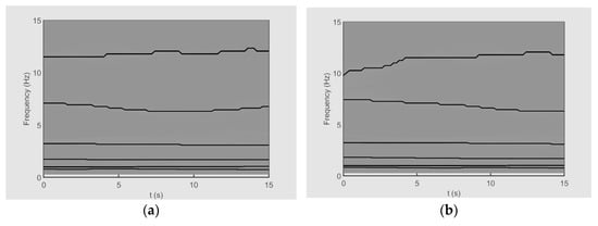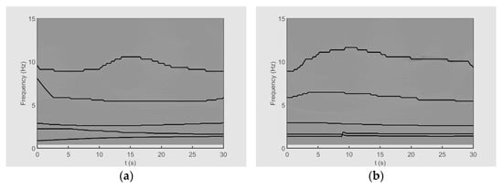 The TFRs of the sideslip angle for datasets A and B are illustrated in Figure 15. Also, the TFRs of the roll angle for datasets A and B are shown in Figure 16. In these figures, the ridges corresponding to the optimal IMFs obtained by the ESST are plotted by black lines. It can be seen that the sideslip angle and the roll angle have five high-energy ridges for both datasets. Based on the results, the extracted IMFs have similar frequency content. This observation verifies the existence of identical “non-traditional” flight modes with non-stationary characteristics at different flight conditions.