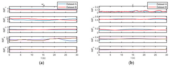 Once the optimal longitudinal IMFs are extracted, the instantaneous characteristics of flight modes can be calculated using the method described in Section 4. The instantaneous undamped natural frequency and damping ratio of the angle of attack and pitch angle for both datasets are illustrated in Figure 11 and Figure 12. As can be seen, the corresponding IMFs for datasets A and B have similar instantaneous undamped natural frequencies and damping ratios. In other words, the identified flight modes exist in different datasets. Furthermore, the instantaneous characteristics of the IMFs obtained for the angle of attack are very similar to those of the pitch angle. Hence, the identified flight modes exist in all the longitudinal flight parameters.