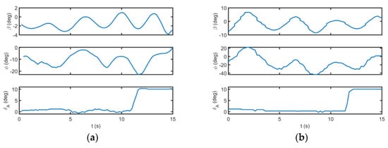 The ESST is also applied to the lateral flight parameters. The time histories of lateral flight parameters are illustrated in Figure 14 for datasets A and B. As can be seen, the flight tests are performed by similar aileron step commands; nevertheless, the initial flight conditions of datasets A and B are different.