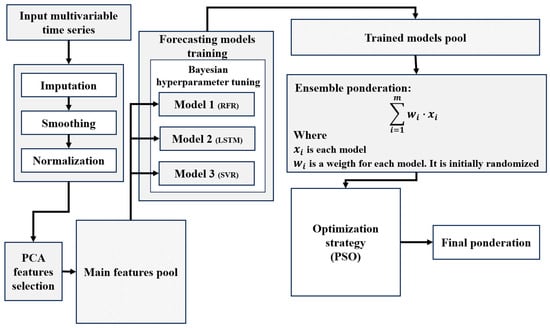 Multivariate time series forecasting represents a significant challenge due to multiple factors affecting its performance. This process requires rigorous preprocessing to ensure complete, consistent, high-quality data, eliminate outliers, and, in many cases, to solve the missing data problem. In addition, it is essential to implement feature selection strategies that reduce the problem’s dimensionality, preserving as much explained variance as possible. Subsequently, forecasting models should be trained with modern and robust machine learning techniques, selecting them for their outstanding performance on similar problems, in part of the problem; in our case, we consider it more effective to select them by their performance in the validation section of each time series. In other words, using a heuristic ensemble ensures a broad exploration of the solution space, achieving high-performance predictive models.