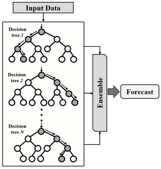Each tree generates an independent prediction, and, in the end, these predictions are combined by an operation (usually the arithmetic mean) to obtain the final result. This approach reduces variance and improves the model’s ability to capture complex nonlinear relationships. Figure 2 shows this flow, while Table 2 details the hyperparameters used, such as the number of trees, maximum depth, and splitting criteria.