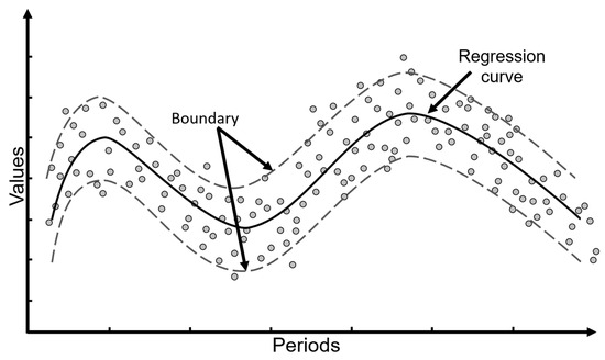 Regarding time series, SVR captures complex patterns in the data using kernel functions, which allow modeling nonlinear relationships between variables. This method is especially useful in highly nonlinear problems, and represents typical behavior of atmospheric data [39]. Figure 3 shows a graphical representation of the function fitting process using SVR. The circles in the input and output of the boundary region represent events of a general process. Moreover, the width of this boundary delimited by broken lines represents the confidence interval, delimited by the parameter ϵ or controlled margin, allowing to focus on predicting relevant patterns. The hyperparameters listed in Table 3 follow the standard formulation commonly adopted in the literature for SVR models [38,39]. They are the penalty parameter C, the epsilon parameter ε, and the kernel coefficient γ. The C parameter controls the trade-off between the model complexity and the degree to which deviations greater than ε are penalized. The epsilon ε defines a margin of tolerance where no penalty is given to errors, effectively shaping the SVR loss function. The configuration of the hyperparameters used, including γ, ϵ, and C, is detailed in Table 3. These hyperparameters were obtained by Bayesian experimentation [40,41].