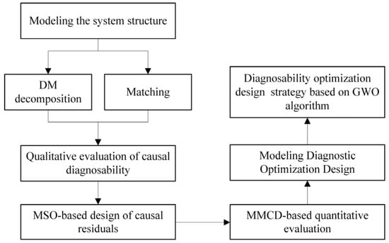 To improve the reliability as well as causal diagnosability of UAVs, this study proposes a diagnosability optimization design strategy based on the MMCD and GWO algorithms. The logic of the proposed approach is shown in Figure 1. First, based on structural analysis, the relevant graph theory tools of Dulmage–Mendelsohn (DM) decomposition and matching are used to analyze the structural characteristics of the system based on its structural characteristics and establish the evaluation index of causal diagnosability. Second, based on MSO-designed system residuals, the problem of quantitatively evaluating diagnosability is transformed into analyzing the probability distribution differences of residuals, and a quantitative diagnosability assessment strategy based on MMCD is proposed. Finally, a diagnosability optimization design strategy based on the GWO algorithm is proposed to reduce the cost of the diagnostic system.