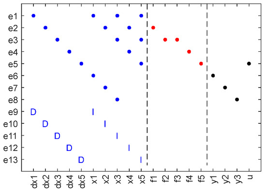 of is shown in Figure 2. In Figure 2, the variables are represented by the columns of the association matrix of , and the rows indicate the equations. Among them, ‘•’ represents standard edges, ‘D’ represents edges related to in the added constraint equations, and ‘I’ represents edges related to in the added constraint equations. The structural analysis exclusively focuses on the structure associated with the unknown variable , i.e., the blue part in Figure 1. For ease of description, the structural model associated with is defined here as .