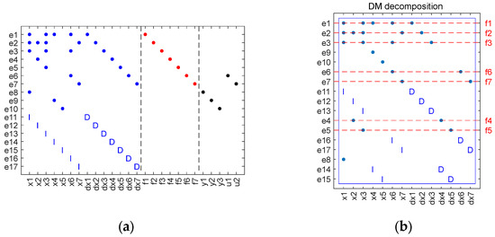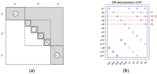 The structural model of and the DM decomposition schematic are shown in Figure 9. As shown in Figure 9a, the dynamic constraint equation shown in Equation (2) is also added to the structural model of . As shown in Figure 9b, .
