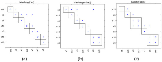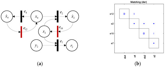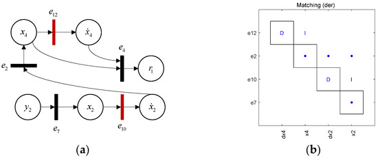 For , when , , and are sequentially selected as the redundant equations, the causal matching relationship is shown in Figure 6. As shown in the figure, when is a redundant equation, is mixed causal. When is a redundant equation, is integrally causal. When is a redundant equation, is differentially causal. Therefore, the causality of MSO is related to its maximum matching. In addition to the matching edge ‘•’, if its maximal matching exists only in the differential edge ‘D’, it is differentially causal. If its maximal matching exists only in the integral edge ‘I’, it is integrally causal. If its maximal matching contains both integral and differential edges or only the standard edge ‘•’, then it is mixed causal. Equations (3) and (4) demonstrate that the duplicate MSO has the same sensitivity relation to faults, although its causal relations are different.