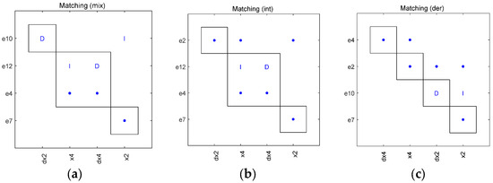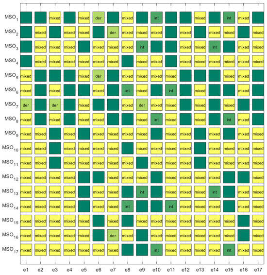 Using the search method reported in the literature [27], the MSOs of can be obtained as shown in Figure 10. The rows of the matrix in Figure 10 illustrate the MSOs, the columns illustrate the equations, and the elements of the matrix contain {‘int’, ‘der’, ‘mixed’} as well as empty elements. The empty element of the matrix means that the equation corresponding to the column in which the position is located is not among the MSOs corresponding to its row. If the element of the matrix is not empty (i.e., {‘int’, ‘der’, ‘mixed’}), it means that the equation corresponding to the column where the position is located is in the MSO corresponding to the row. As an example, . Further, suppose the matrix element is ‘int’(‘der’, ‘mixed’). In this case, it means that when the equation corresponding to the column in which the position is located is selected as the redundant equation, MSO is integrally (differential, mixed) causal. Taking as an example, if , , and are selected as redundant equations, the causal relationships are shown in Figure 11. As shown in Figure 11a, when is chosen as the redundant equation, the maximum matching relation of contains only ‘D’ except for the normal edges, so it is differentially causal. Similarly, when is a redundant equation, is mixed causal; when is a redundant equation, is integrally causal.