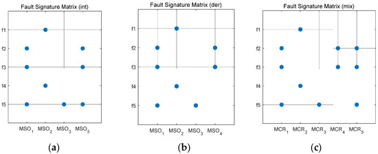 Fault signature matrix of . (a) Integral causality. (b) Differential causality. (c) Mixed causality.