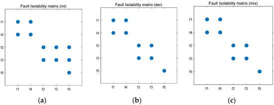 Fault isolability matrix of . (a) Integral causality. (b) Differential causality. (c) Mixed causality.