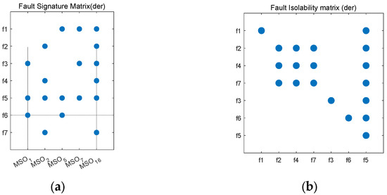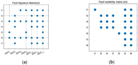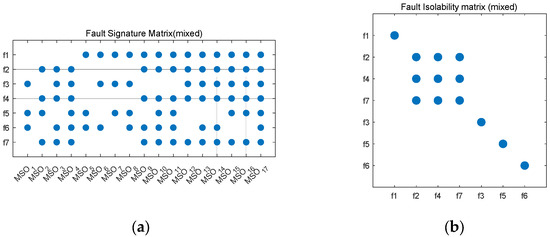 Diagnosability analysis results of . (a) Fault signature matrix. (b) Fault isolation matrix.