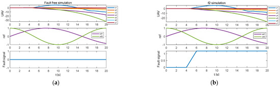 To verify the diagnosability of different faults and the responsiveness linking MSOs to faults, the sequential residual method is used for residual design. Figure 15a displays the simulation results of without fault, where and are the reference input signals. When occurs, the simulation results of are shown in Figure 15b, and all the system faults are slope faults as shown in the figure. The used simulation software was MATLAB (2021b version). The initial state of the system is , and noise is not considered here. Based on (, ), (, ) is selected as the redundancy equation to design the residual (, ). As shown in Figure 10, the residuals are integrally causal, and Figure 16a displays each residual’s simulation results. Figure 16a shows that jumps when faults occur, which is consistent with the mapping relationship between and faults shown in Figure 12a. This further verifies the reasonableness and validity of the causal diagnosability. Comparing the residuals in the figure, it can be observed that when the fault occurs, the exact causal residuals are inconsistent in the degree of jump to the fault. For example, the magnitude and direction of the jumps of to are inconsistent. The larger the degree of the leap of the residual to the fault is, the stronger the diagnostic ability of the residual to the fault and the better the diagnosable performance.