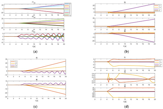 To confirm how residuals affect diagnosability, the residuals , , and are designed based on , and equations , , and are selected as redundant equations, respectively. From Figure 9, , , and are differentially causal, and the simulation results of the residuals for , , and are shown in Figure 16d. Figure 13a shows that has a sensitive relationship with , , and . As shown in Figure 16d, when the selected redundancy equation is , the differential residual designed based on has the most significant jump and the strongest diagnostic performance. Therefore, different residuals have different impacts on diagnosability.
