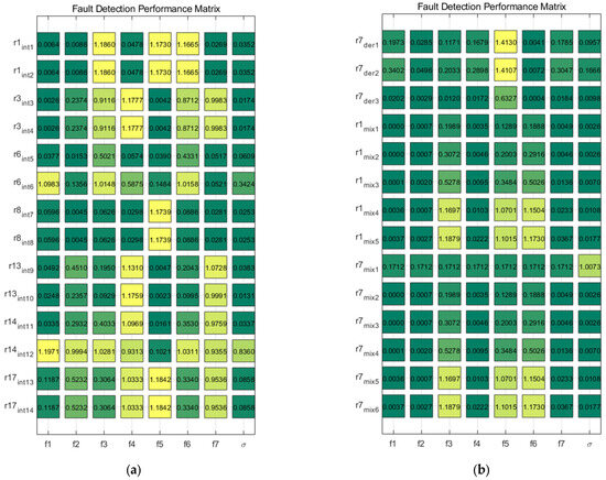 Structural analysis can only qualitatively analyze the diagnosability, so this paper proposes a quantitative assessment method based on MMCD. As shown in Figure 12, there are a total of seven integral causal MSO; namely, . As shown in Figure 10, two integral causal residuals can be designed for each integral causal MSO. The integral causal residual of the is . Based on MMCD, the fault detection matrix for can be obtained, as shown in Figure 17a. The first seven columns reflect the faults, the final column represents the diagnosability limit (), and the rows of represent the residuals. For example, represents the diagnosability of for , and represents the diagnosability limit of . As , cannot diagnose . Further, as , can diagnose . The sensitivity of to the faults is . From a qualitative point of view, cannot diagnose fault . However, a coupling relationship exists between the states. When a fault occurs in one state, it affects the changes in other states because the fault is transmissible. Therefore, from a quantitative point of view, can diagnose . This also reflects the advantage of quantitative assessment.