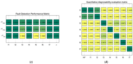 When in Figure 17a is selected as the diagnostic system, the fault diagnosis matrix of is displayed in Figure 17d. Here, the detectability limit , and the isolability limit . As , can diagnose all faults except , which is consistent with the sensitivity of and to faults, as shown in Figure 12a. The fault detection rate of is . As fault diagnosis is a prerequisite for fault isolation, and are meaningless. As , , and , the fault isolation rate of is . As shown in Figure 11a, from a qualitative assessment point of view, does not guarantee that the faults are isolated from each other or that the faults are isolated from each other. However, from the perspective of quantitative assessment, the faults in and are isolated from each other. As shown in Figure 16, the sensitivity of the same residuals to different faults and the degree of jump of different residuals when the same fault occurs are different. Based on MMCD, this difference can be quantitatively characterized, which is not possible with qualitative assessment.