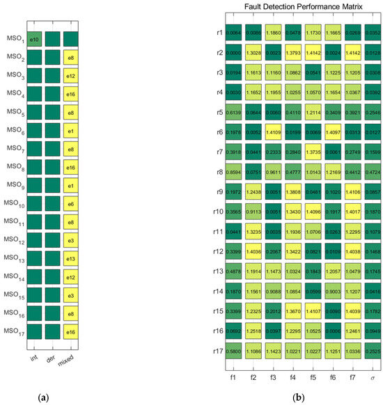 As shown in Figure 17a, comparing the fault diagnostic values of the residuals of the same MSO design, it can be found that the diagnosability is the same for the integrally causal residuals based on . However, the diagnosability of the integrally causal residuals based on designs is different. For comparative analysis, the mixed causal residual is designed based on . The differentially causal residual and the mixed causal residual are designed based on . The fault diagnosis matrix for residual is shown in Figure 17b. The comparative analysis reveals that the fault diagnosis capabilities of , , and are different. Therefore, most of the fault diagnosis capabilities in the same causal residuals based on the same MSO design are inconsistent.