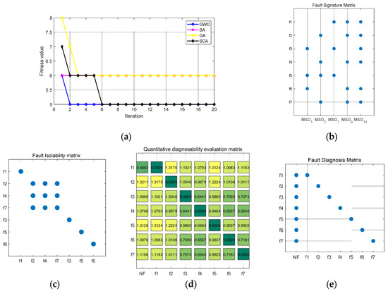Diagnosability optimization results based on the GWO algorithm. (a) Fitness curves. (b) Fault signature matrix. (c) Fault isolation matrix. (d) Diagnosability quantitative assessment matrix. (e) Fault diagnosis matrix.