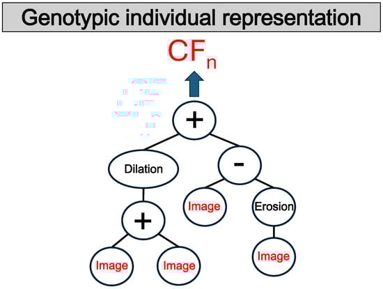 Considering the representation, the nodes in the tree can be functions, variables, and constants. The internal nodes can be used to implement and represent a computational program, arithmetic functions, or another function the programmer implements as needed. On the other hand, the leaf nodes always contain variables and constants. The scope of our method is to make a feature extraction and construction from the images. In this way, the set of functions to construct the individuals correspond to image processing filters, pixel operations, and morphological operators. According to the aforementioned, the leaf nodes correspond to the raw image data for our implementation, acting as the individuals’ inputs. The final result is the set of functions used to extract the most representative information to perform the segmentation.