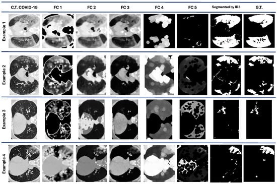 COVID-19 dataset results. The first column contains the original images. are the images processed by each best individual for each evolved population. The ID3 column contains the images segmented by the model at the pixel level. The G.T. column contains objective images.