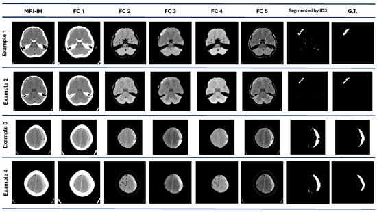 Finally, in the MRI-IH, the algorithm performance achieves a mean and median value of 0.44 and 0.43, respectively. This dataset was the most challenging part of the proposal. The best value achieved is the lowest compared to the other datasets, with only a 0.56 DICE value. Also, it has the second-lowest value for the worst performance in the different datasets. The visual results with this dataset are shown in Figure 5. In example 1, the segmentation results show some regions marked as ROI, according to the G.T. Examples 3 and 4 show a good visual performance. However, some regions are discarded and include areas that do not correspond to the ROI.