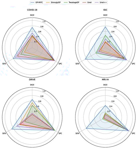 Figure 6 contains a radar chart for each dataset, where the benchmark methods are compared with our method GP-MIFC in terms of DICE, specificity, and sensitivity metrics.