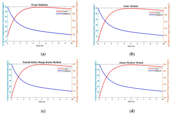 In Figure 1, the Euler method shows significant deviations from the exact solution, especially in the scenario with rapidly changing drug concentrations. This method was less accurate and stable compared to the fourth-order Runge–Kutta method. The greater accuracy and simplicity of the Euler method come with increasing errors and limitations in handling complex reaction kinetics and rapid changes in drug concentration. A predictor correction method, the Adams–Bashforth–Moulton method, showed intermediate performance between the Euler method and fourth-order Runge–Kutta method. It gave more accurate results than the Euler method, but still had more deviations from the exact solution than the fourth-order Runge–Kutta method.