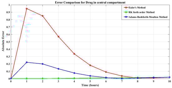 Table 3 illustrates the absolute errors for drug concentration in the central compartment at various time intervals. All three approaches demonstrate some degree of error, with the fourth-order Runge–Kutta method having the lowest error when compared to the Euler method and Adams–Basforth–Moulton method. This suggests that the fourth-order Runge–Kutta technique predicts drug concentrations more accurately in the central compartment. As the simulation progresses, the error decreases, showing that the numerical approaches converge to the exact solution over time. However, at the end of the process, there are some errors and deviation in all approaches, as shown in Figure 2.