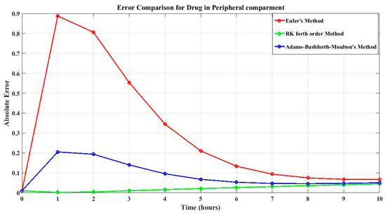 Table 4 shows the absolute errors for drug concentration in the peripheral compartment at various time points. In terms of the best approach, a comparison of errors shows that the fourth-order Runge–Kutta method consistently produces the lowest errors among the three ways for calculating drug concentration. As a result, the fourth-order Runge–Kutta method is the most reliable and accurate solution for simulating drug concentrations and optimizing dosing techniques in this specific pharmacokinetic system, not only for the drug concentration in the central compartment but also for the drug concentration in the peripheral compartment. The errors tend to decrease as time increases, indicating convergence towards the exact solution, as shown in Figure 3.