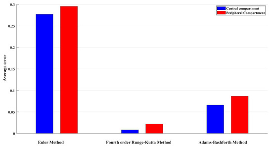 Three numerical approaches were used to determine the errors for drug concentration in the central compartment, including Euler, fourth-order Runge–Kutta, and Adams Basforth Moulton. The errors represent the difference in drug concentrations predicted by each approach, and the exact solution.