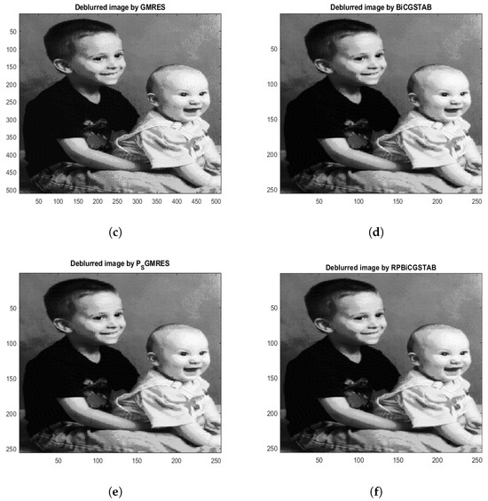 Kids image [8]: (a) presents the original image; (b) shows the blurred image; (c) depicts the deblurred image obtained with GMRES; (d) illustrates the deblurred image produced by BiCGSTAB; (e) displays the deblurred image generated using ; (f) demonstrates the deblurred image achieved with RPBiCGSTAB.
