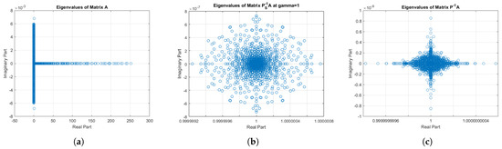 As a result, we establish that . By applying the convergence theorem related to the BiCGSTAB method for the linear system (21), we reach the conclusion presented in the theorem. According to Lemma 1, the convergence characteristics of the RPBiCGSTAB method are heavily influenced by the parameter . Therefore, it is crucial to analyze the eigenvalues of . □