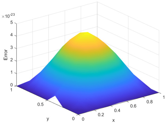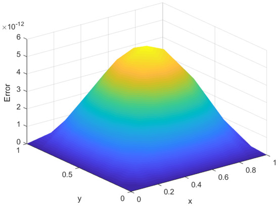 Figure 7, Figure 8, Figure 9 and Figure 10 show the spatiotemporal diagrams of the solution and error for the time step size and spatial step size .