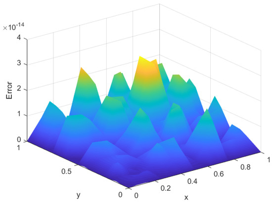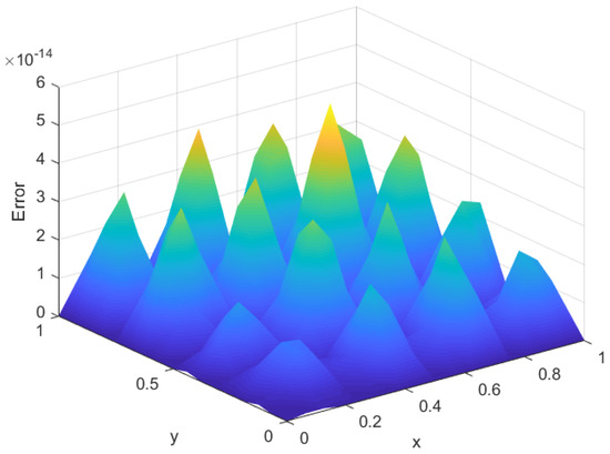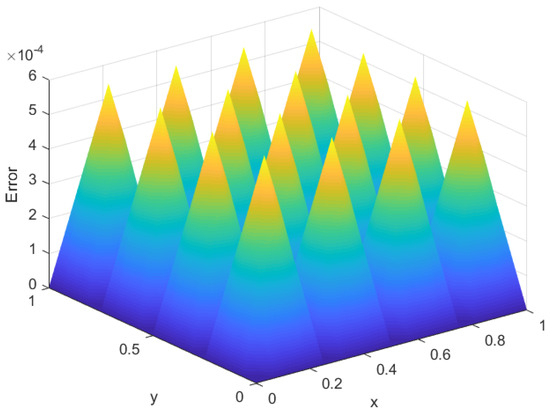 Figure 7 and Figure 8 show the spatiotemporal diagrams of the solutions obtained using the FD scheme and the POD reduced scheme, respectively. Figure 9 and Figure 10 show the spatiotemporal diagrams of the errors corresponding to the FD scheme and the POD reduced scheme, respectively. Figure 11 shows the error plot between the FD scheme and the old POD reduced scheme at time with the time step size and spatial step size . Figure 12 shows the error plot between the FD scheme and the new POD reduced scheme at time with the time step size and spatial step size . A comparison between Figure 11 and Figure 12 reveals that the FD scheme and the new POD reduced-order scheme exhibit smaller errors, demonstrating the superiority of the new POD reduced-order approach.