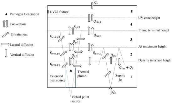 In UFAD spaces, the density interface is considered an indicator of good IAQ if it is above 1.2 m (sitting height), as it determines the height of the occupied zone. The plume terminal height is defined as being the level at which the temperature gradient vanishes and the plume spreads horizontally. The unidirectional flow region above the terminal height of the plume is divided into two layers since the UVGI does not cover the entire region. The schematic of the space model showing the different air layers and the physical phenomena affecting species transport is depicted in Figure 1.