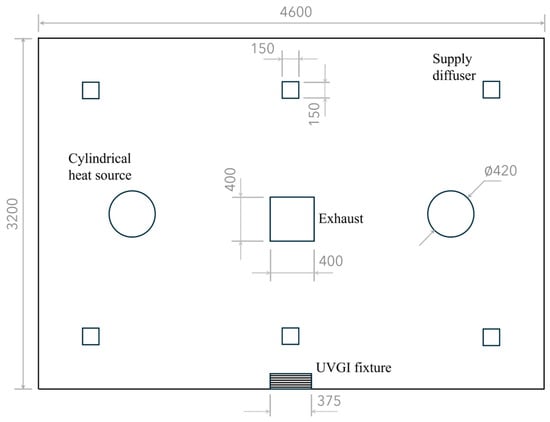 Plan view of the UFAD-UVGI room. Dimensions are in millimeters.