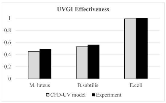 The developed CFD-UV model was validated using the experimental work of [30], where they assessed the effectiveness of upper room UVGI in disinfecting indoor air from three types of bacteria, M. luteus, B. subtilis, and E. coli, under steady-state conditions. Their experimental setup included an 80 W thermal manikin representing a seated occupant and an upper room UVGI system with 15 W UVC lamps, installed with the lower edge of the housing at 1.75 m above the floor. The bacteria were generated using a six-jet nebulizer at a rate of 14 L/min. Experiments were conducted for various configurations of the upper UVGI system. For the configuration with one operating lamp with horizontal louvers, the average UV irradiance at 2.1 m measured 1.60 W/cm2, while our irradiation model yielded a value of 1.42 W/cm2, with less than 12% error. Additionally, the average irradiance within the occupied zone did not exceed the permissible 8 h exposure limit of 0.2 μW/cm2 for occupant safety [45]. Furthermore, the same experimental work was used in our previous study [18] to validate a similar CFD-UV model based on UVGI efficacy values. The validation scenarios involved a single un-louvered 15 W UV lamp. The UVGI effectiveness values obtained from the CFD simulations for the three types of bacteria closely matched the reported experimental results, with an error margin within 8%, as shown in Figure 4. This demonstrates strong agreement between the model predictions and experimental data.