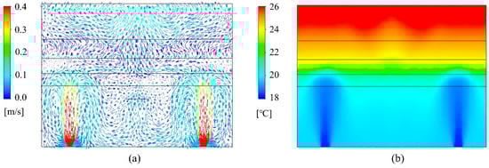 The UFAD room was simulated using the developed CFD model under four scenarios: (a) 100% fresh air without UVGI, (b) 100% fresh air with UVGI, (c) 50% fresh air without UVGI, and (d) 50% fresh air with UVGI. The velocity fields remain invariant across all scenarios. The air temperature distribution is similarly unaffected since the return air is mixed with outdoor fresh air upstream of the cooling coil, and the UV field has no significant impact on thermal flow transport. Figure 5a illustrates the indoor velocity vector field, taken along a cut plane intersecting a pair of supply diffusers, demonstrating the CFD model’s ability to accurately capture the supply jet dynamics, its downward return, and other UFAD flow characteristics. As expected, the airflow exhibits limited mixing in the lower occupied zone, enhancing air cleanliness and thermal comfort. In contrast, the upper room is characterized by unidirectional flow, facilitating the direct transport of droplet nuclei toward the exhaust vent. The thermal fields at the previously mentioned sampling plane are shown in Figure 5b, clearly illustrating thermal stratification. By maintaining cooler temperatures in the occupied zone and directing heat upward, UFAD systems enhance occupant comfort while improving energy efficiency. Notably, the interface heights of the multilayer model, calculated prior to the simulations, were reasonably estimated.