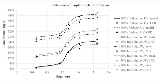 The vertical distribution of SARS-CoV-2 droplet nuclei predicted by the multilayer transport model was compared with CFD results under three ventilation scenarios: 100%, 80%, and 50% fresh air. For each layer, the average volume concentration from the CFD model was evaluated against the mid-layer concentration predicted by the simplified model, both with and without UV. Figure 7 presents a comparison of airborne pathogen concentrations as a function of height, illustrating the agreement between the multilayer model and CFD predictions with a maximum discrepancy of 12% in UVGI cases and 7% in cases without UVGI.