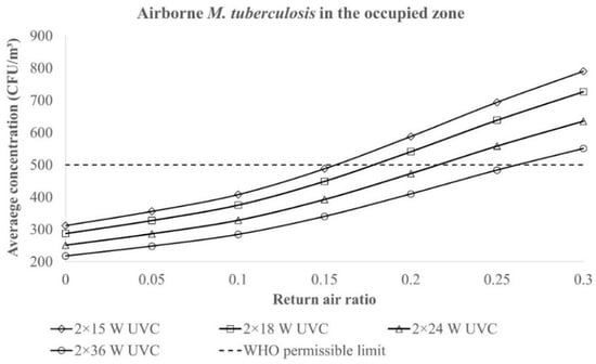 Variations in the M. tuberculosis concentration in the occupied zone with the mixing ratio and total UV output.